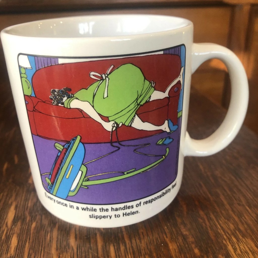 One of these treasures is a coffee mug that my mother loved and drank out of whenever she visited me. As you can see from the image below, the cup is a cartoon of a woman who has collapsed onto the couch in the middle of her chores. She’s wearing a housedress and apron, and she appears to have curlers in her hair. When I bought this (at a Hallmark store, I think), I laughed and laughed. This looks so much like my mother did when I was growing up. She almost always wore a housedress like that, sometimes wore the half-apron (without the bib portion), and slippers. (I think housedresses were the yoga pants of that generation.) Mom loved an afternoon nap, usually before school let out for the day. I would often come home and find her napping. That was probably the only peace and quiet she had all day.